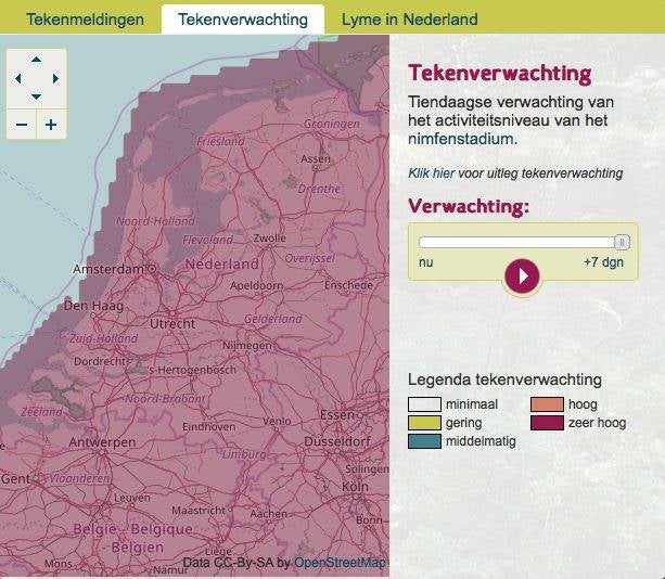 De komende week is Nederland rood gekleurd op de tekenradar, dat betekent dat het activiteitsniveau van nimfen zeer hoog is! Een nimf is slechts een mm. groot, zo "groot" als een maanzaadje. Doe daarom na iedere activiteit in het groen een tekencheck, voorkomen is immers beter dan genezen.